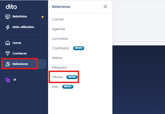 No menu da plataforma, navegue “Relacionar” e clique na opção "Vitrine”.