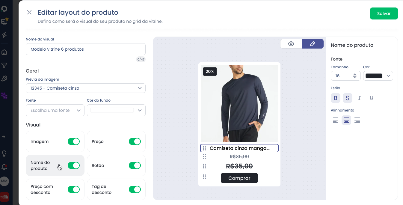 Ajuste e salve o Layout do Produto de acordo com a identidade da sua marca. (Ou use o Layout padrão)