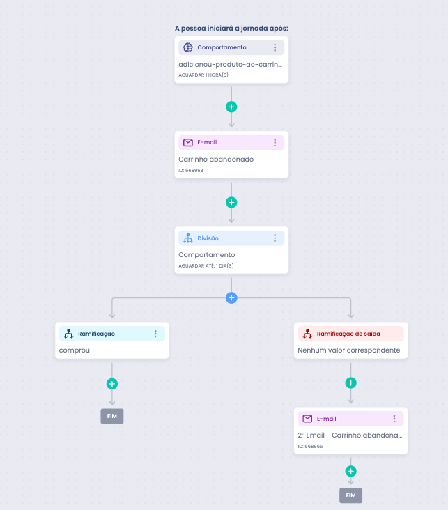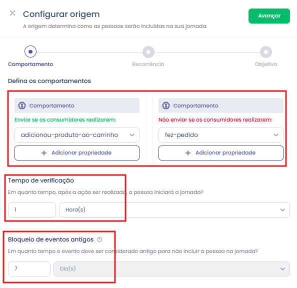 Atenção: O fez-pedido está conectado apenas ao ambiente digital, caso o consumidor realize compras em loja física ele ainda será considerado na jornada. Para considerar compras em loja física aumente o tempo de verificação para 24 horas e utilize o evento “comprou”