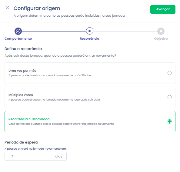 O campo de recorrência define quando, após entrar 1x na jornada, o consumidor estaria elegível a entrar novamente.