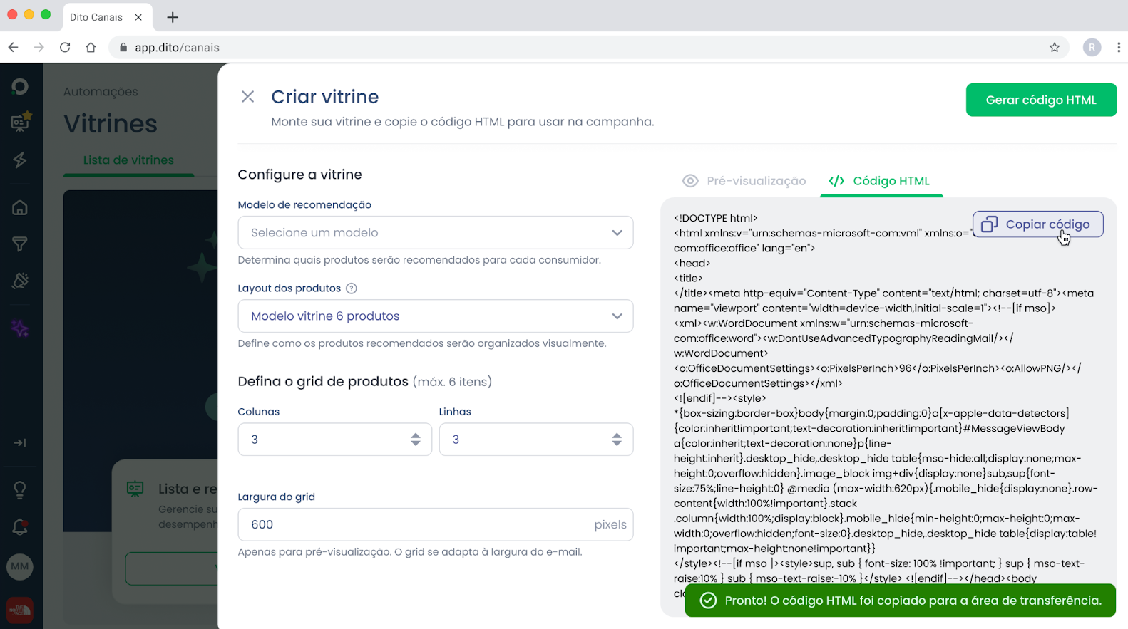 Gere e copie o Código HTML: Clique no botão “Gerar Código HTML” para processar a sua vitrine. Isto irá desbloquear a sessão "Código HTML” que você poderá copiar o Código.