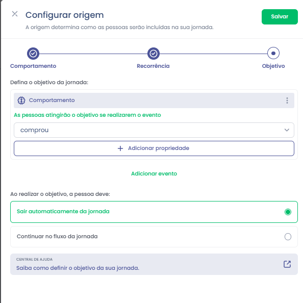 Selecione a opção “sair automaticamente da jornada” para concluir a participação do consumidor na jornada, ativar o intervalo de recorrência customizada e estar elegível a receber novamente caso realize os comportamentos esperados.