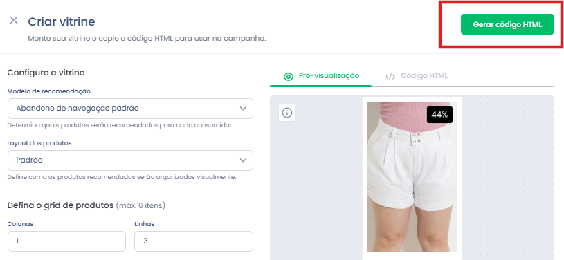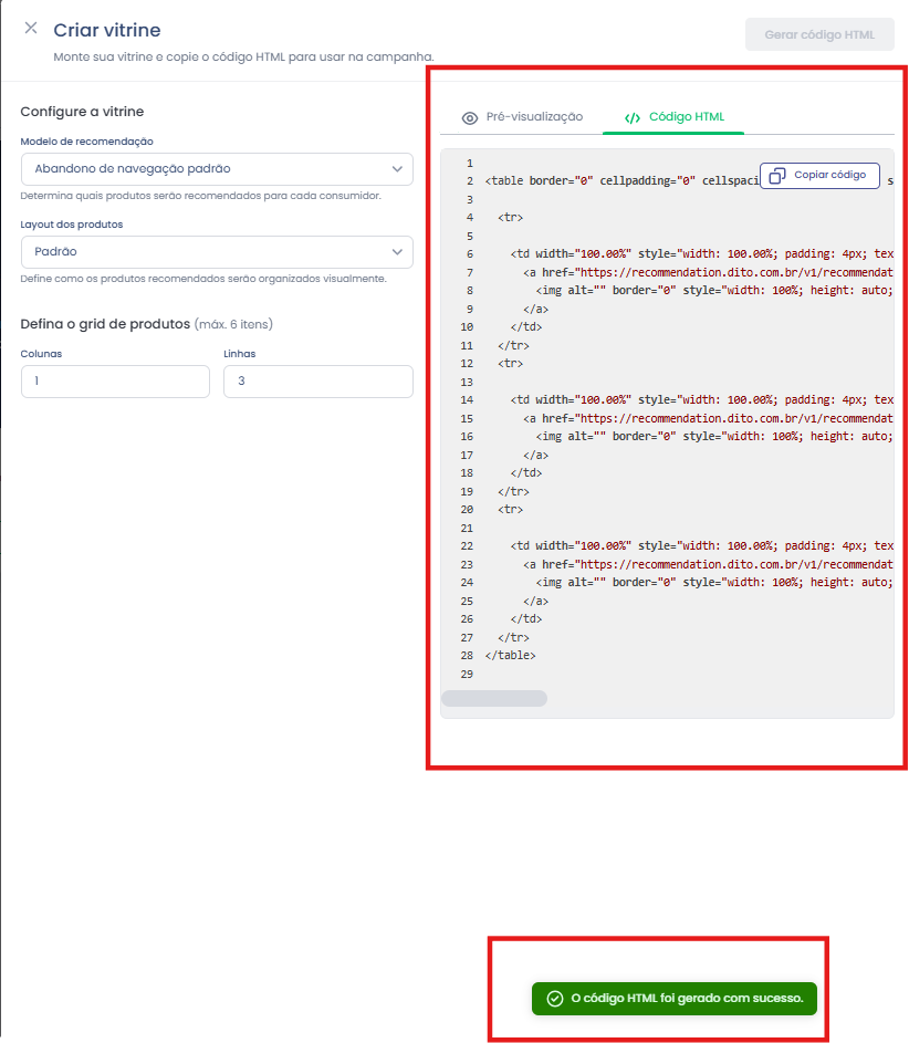 - Gere e copie o Código HTML: Clique no botão “Gerar Código HTML” para processar a sua vitrine. Isto irá desbloquear a sessão "Código HTML” que você poderá copiar o Código.