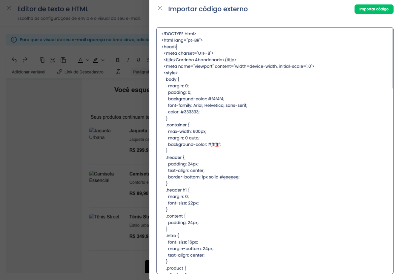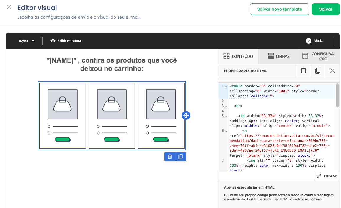 Insira no E-mail: Cole o código copiado no bloco de HTML da Dito CRM. Você pode: