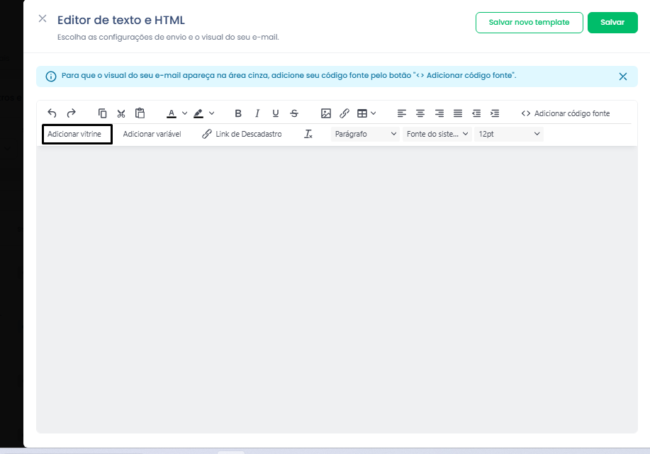 No editor de texto e HTML, utilize a funcionalidade "Adicionar Vitrine" para montar a sua vitrine de "Produto baixou de preço".