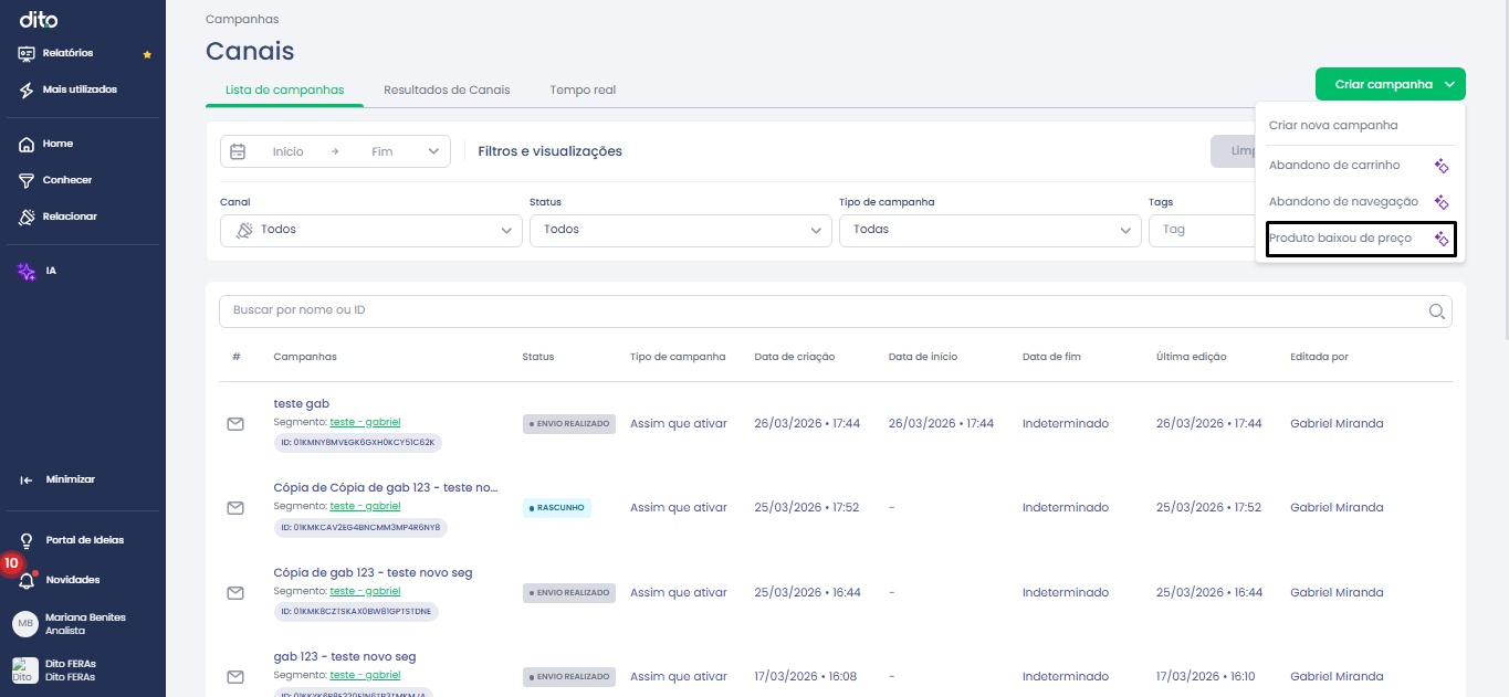 Para marcas clientes da funcionalidade Vitrine de Produtos, use os atalhos de criação de campanhas da Dito para criar uma notificação especial do tipo “Produto baixou de preço”.