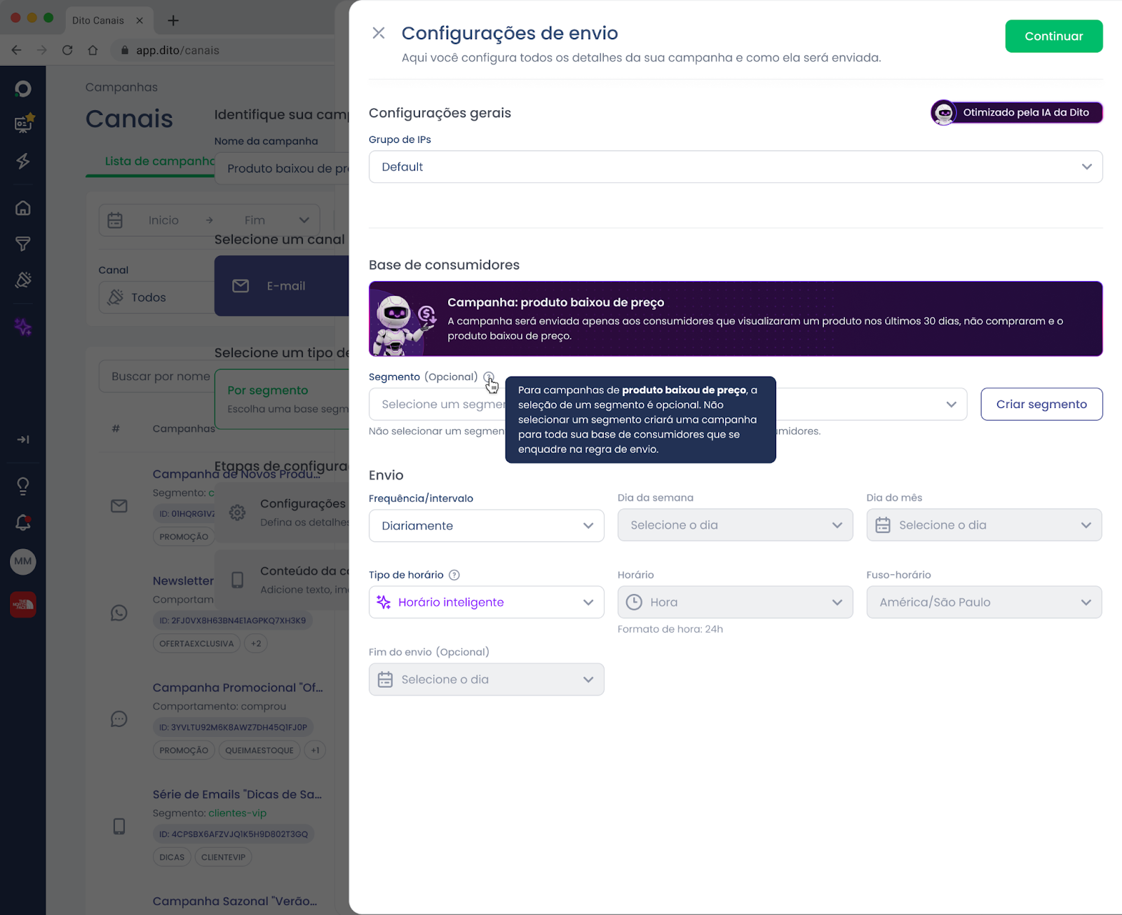 A campanha "Produto baixou de preço" é baseada em segmentação, mas, diferentemente das campanhas tradicionais, a segmentação é OPCIONAL. Ao escolher esta campanha, a inteligência da Dito gera automaticamente um segmento que inclui toda a sua base de consumidores.
